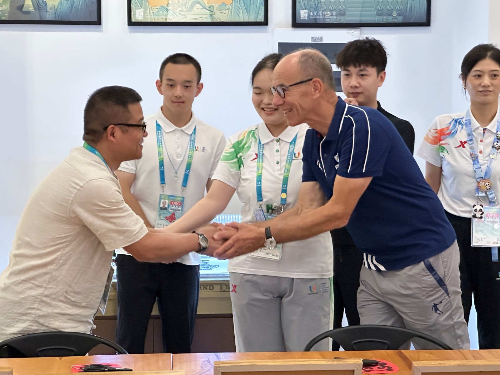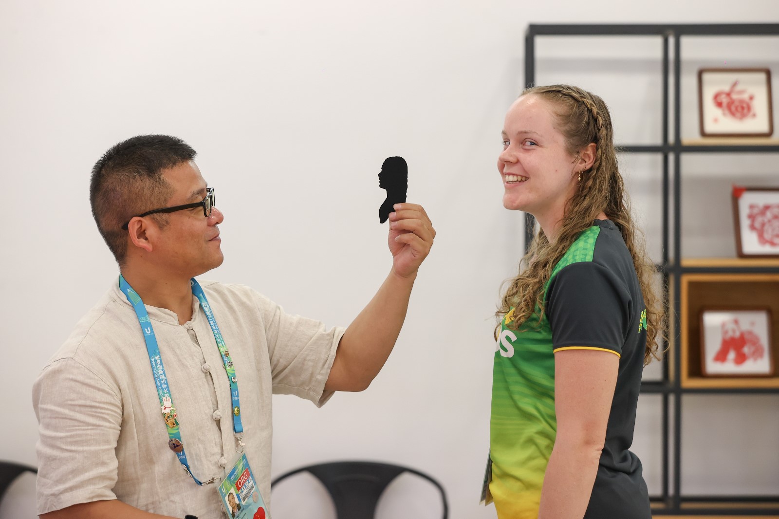 莊叢燦的剪影作品和其耐心負責的剪紙教學倍受運動員們“點贊好評”的同時,也吸引了國際大體聯(lián)和各國代表團人員前來“沉浸式體驗”。期間,莊叢燦為國際大體聯(lián)代理主席雷諾·艾德和意大利代表團官員彼得羅·伊瓦爾迪進行剪紙教學和剪影留念。