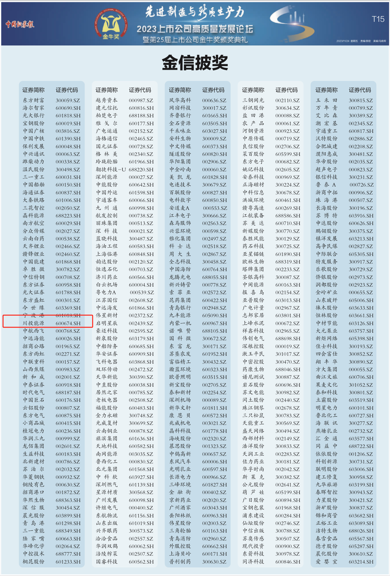 11月24日,由中國證券報主辦的“第二十五屆上市公司金牛獎”榜單揭曉,川投能源憑借穩(wěn)健增長的業(yè)績、不斷提升的綜合實力和高質(zhì)量的信息披露,榮獲“2022年度金信披獎”。