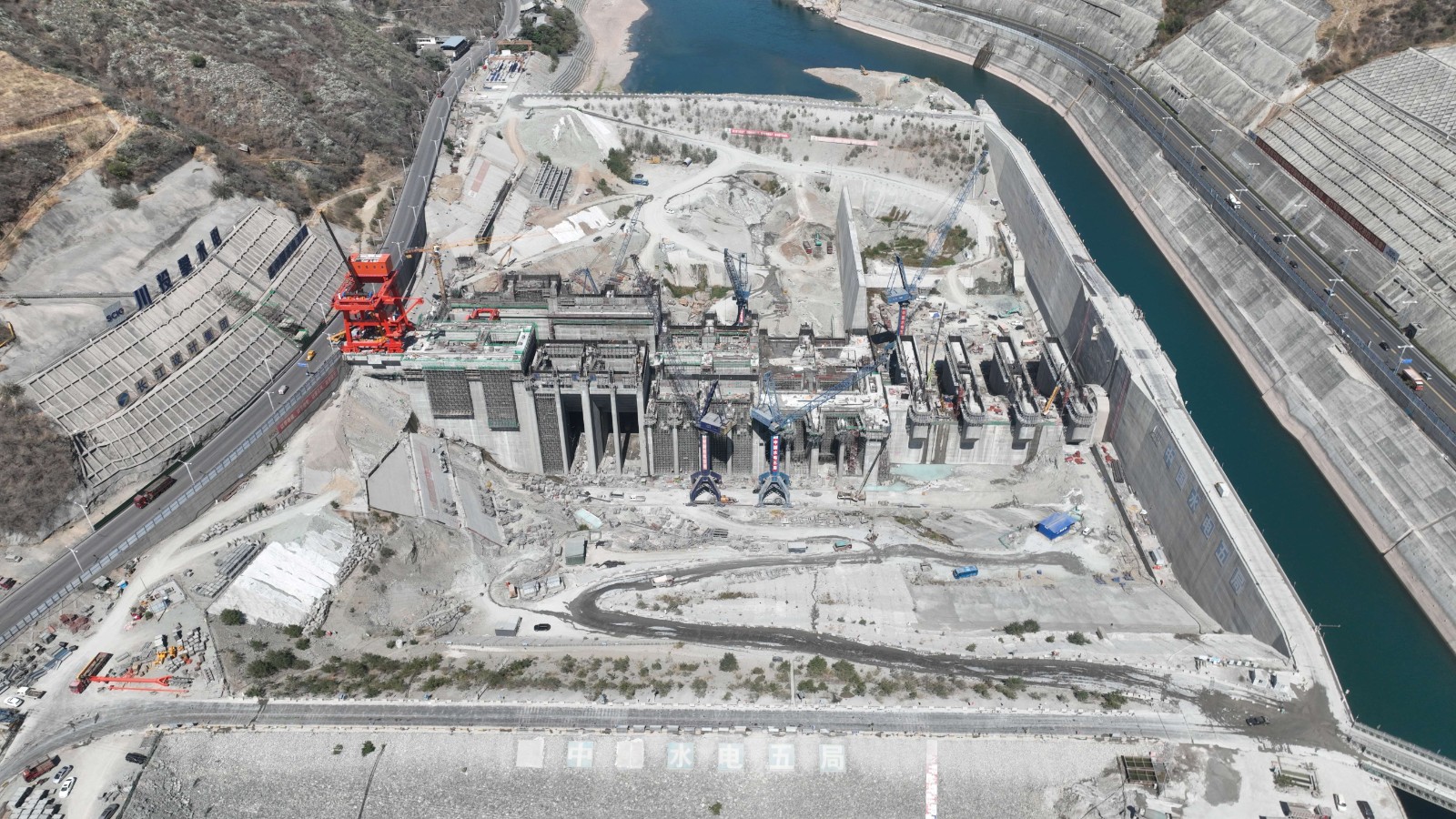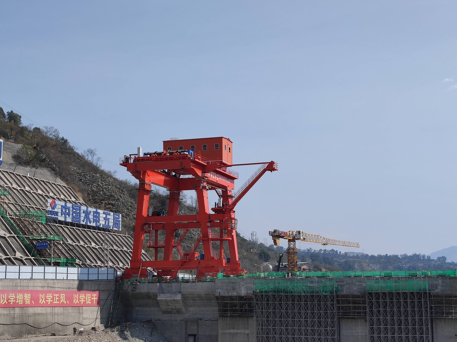 紅色門機迎江矗立?!按蟮踯囌鎱柡?,百噸設(shè)備輕而易舉提抓起來!”今年以來,攀枝花廣大市民陡然發(fā)現(xiàn)銀江水電站大壩上架起了一個紅色的大型設(shè)備,從幾公里外的市區(qū)一眼望去就能映入眼簾,成為銀江水電站的新標(biāo)志。這個紅色巨物就是壩頂門機,高25米,寬16米,最大起吊能力達到500噸,起升高度達75米。是水電站建設(shè)期金屬結(jié)構(gòu)安裝及后期電站運行最重要的設(shè)備之一,2024年將肩負起包括36扇閘門在內(nèi)共計超萬噸的設(shè)備起吊任務(wù)。為順利推進施工,開年以來,川投能源攀水電公司通過增加臨時軌道提前籌備、堅持春節(jié)不停工等措施,加快實施壩頂門機供貨安裝,計劃4月中旬投入使用。