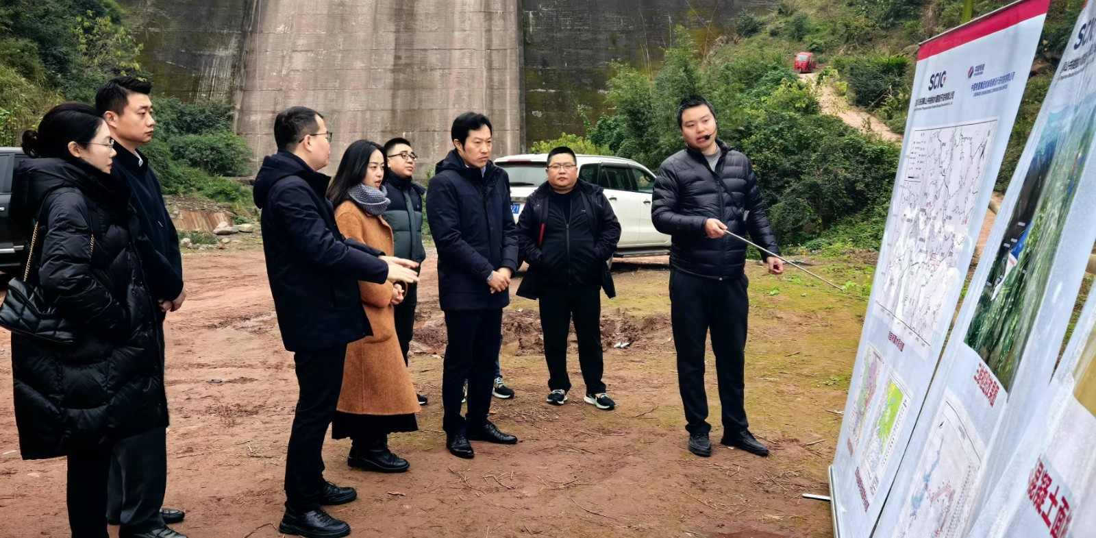 會前,戴月洪一行前往宜賓屏山書樓電站項(xiàng)目進(jìn)行現(xiàn)場調(diào)研,在下水庫壩址位置聽取了項(xiàng)目總體布置情況匯報(bào),在項(xiàng)目補(bǔ)水點(diǎn)和保寧村堆料場進(jìn)行了現(xiàn)場踏勘,詳細(xì)了解了項(xiàng)目現(xiàn)場工作開展情況。