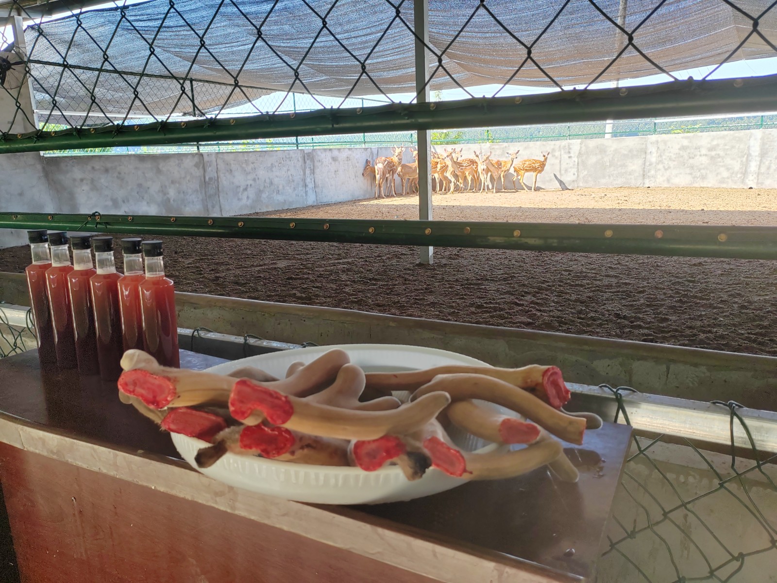當(dāng)天上午,插旗山村梅花鹿養(yǎng)殖基地圍滿了前來的村民,在技術(shù)人員的專業(yè)指導(dǎo)下,飼養(yǎng)員們規(guī)范操作,伴隨著鹿茸鋸清脆的“咔嚓”聲,一對(duì)對(duì)形如珊瑚、色澤鮮亮的鹿茸應(yīng)聲而落,順利完成了首批6只梅花鹿的鹿茸收割。