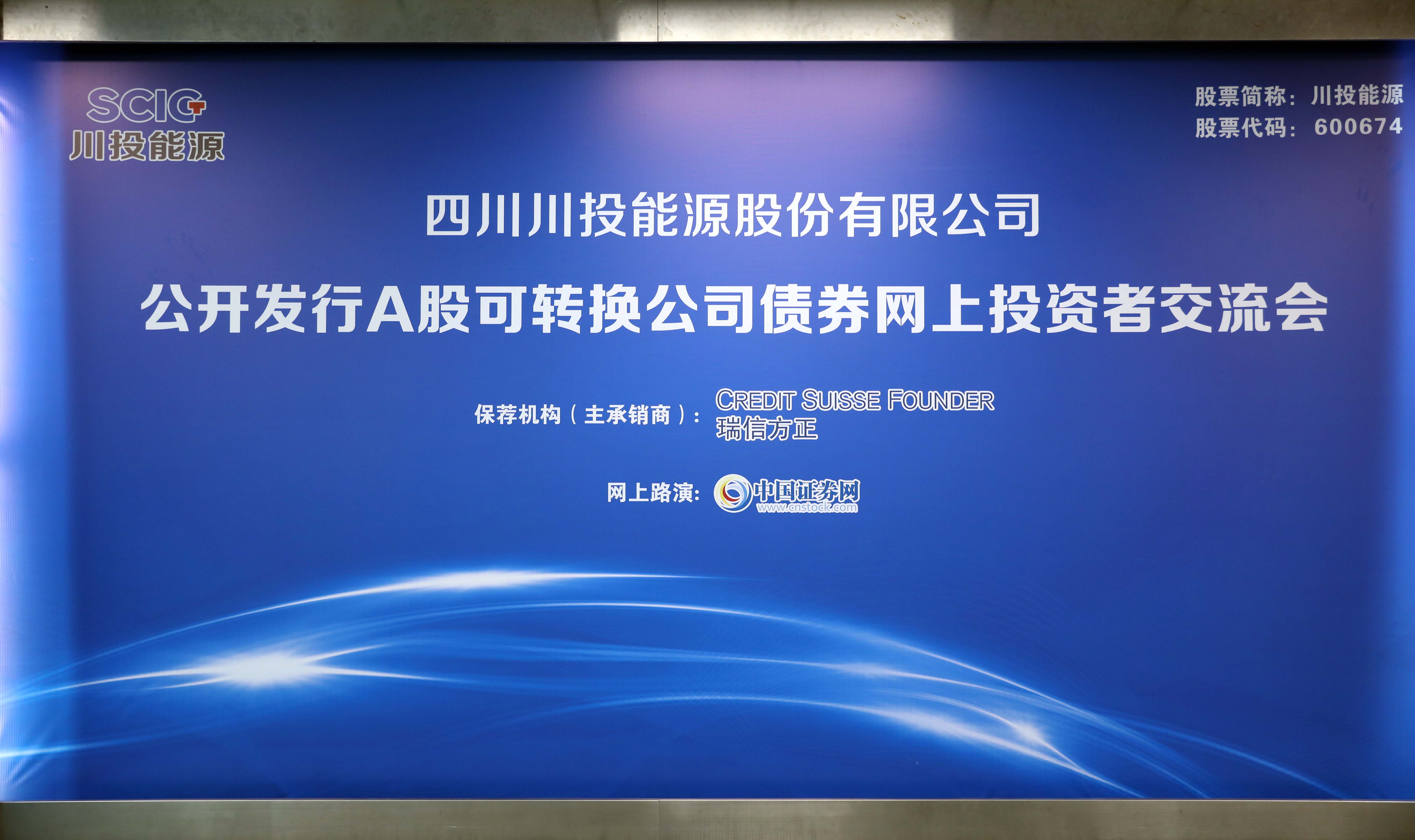 2019年11月8日,川投能源在北京舉行公開發(fā)行A股可轉(zhuǎn)換公司債券網(wǎng)上投資者交流會(huì),公司黨委書記、總經(jīng)理?xiàng)詈?,董事?huì)秘書龔圓,可轉(zhuǎn)債保薦機(jī)構(gòu)——瑞信方正投資銀行部董事總經(jīng)理趙留軍,上海證券報(bào)(中國(guó)證券網(wǎng))總監(jiān)賀建業(yè)等嘉賓出席活動(dòng),通過網(wǎng)絡(luò)同廣大投資者和網(wǎng)友朋友們進(jìn)行了精彩紛呈的互動(dòng)交流。