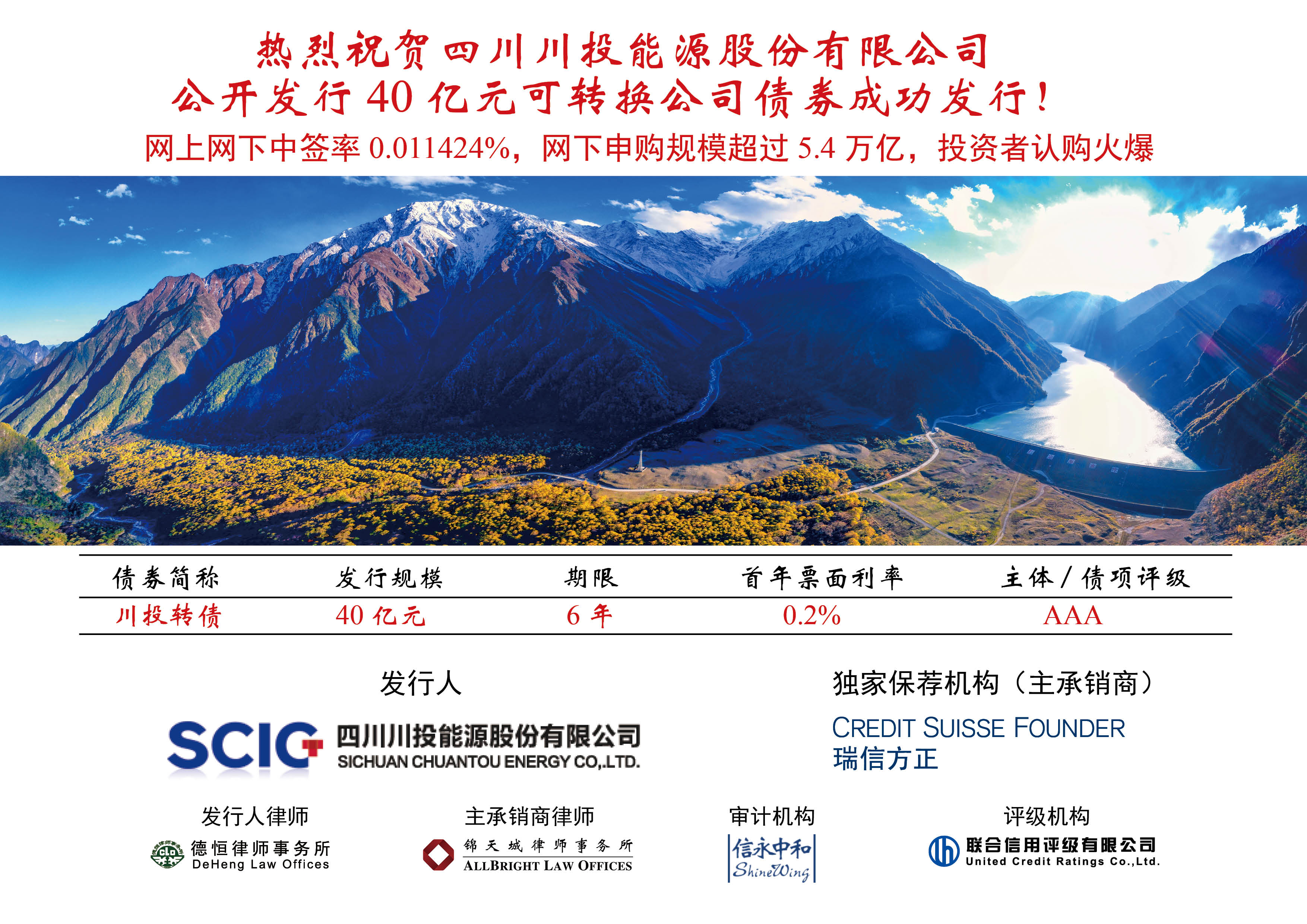 2019年11月15日,四川省投資集團(tuán)有限責(zé)任公司(簡稱“川投集團(tuán)”)控股四川川投能源股份有限公司(簡稱“川投能源”,600674.SH)公開發(fā)行A股40億元可轉(zhuǎn)換公司債券工作取得圓滿成功!40億元募集資金已全額到賬!這不僅是川投能源歷史上規(guī)模最大的一次融資,更標(biāo)志著川投集團(tuán)控股的川投能源上市公司6年資本市場融資工作實現(xiàn)破冰。對于川投集團(tuán)和川投能源優(yōu)化融資債務(wù)結(jié)構(gòu),做優(yōu)做強(qiáng)做大能源主業(yè),以及促進(jìn)四川省國有企業(yè)借助資本市場實現(xiàn)高質(zhì)量發(fā)展意義重大!