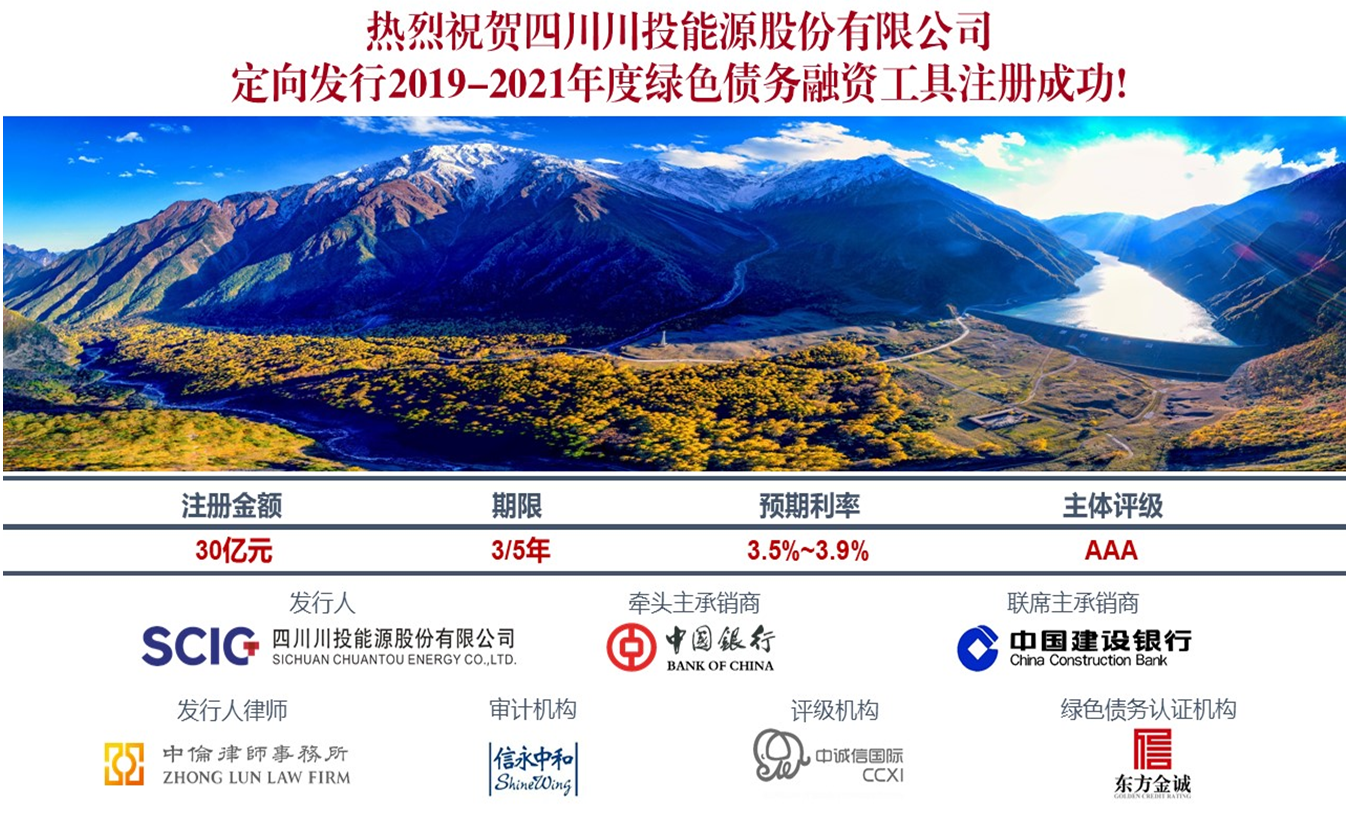 2月18日,川投能源迎來“定向發(fā)行2019-2021年度綠色債務融資工具”注冊成功的好消息。本次私募債注冊金額30億元,公司可在注冊額度內(nèi)分批次或一次性發(fā)行,募集資金將定向用于公司投資的綠色項目建設,期限3/5年。此次為川投能源首次成功注冊私募債綠色債務融資工具,牽頭主承銷商為中國銀行。私募債發(fā)行利率將根據(jù)發(fā)行時的市場情況確定,預期在3.5%-3.9%之間(3-5年期限),遠低于同期限銀行貸款基準利率。