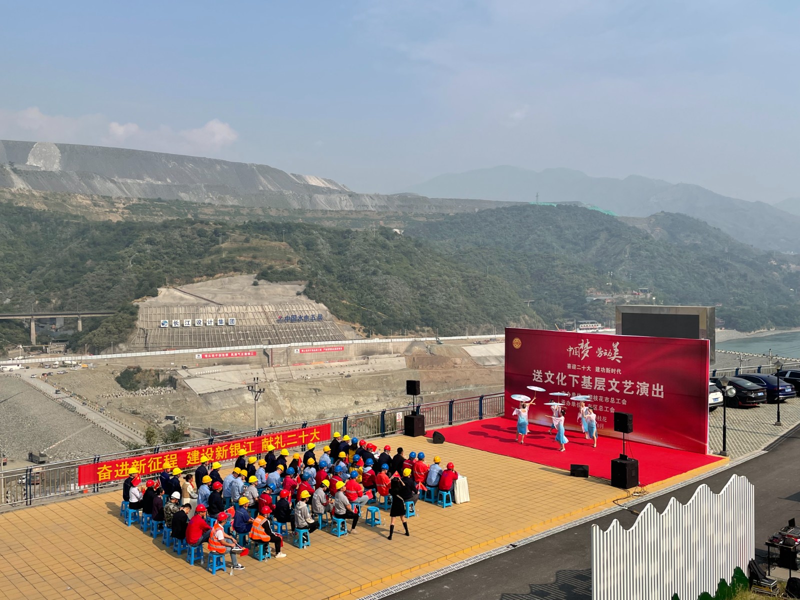 10月19日上午,黨的二十大勝利召開之際,由攀枝花市總工會(huì)主辦、東區(qū)總工會(huì)承辦、攀水電公司工會(huì)協(xié)辦的“中國(guó)夢(mèng)·勞動(dòng)美——喜迎二十大、建功新時(shí)代”文藝演出在銀江水電站七色陽(yáng)光大黨建宣傳陣地拉開帷幕。攀水電黨總支副書記、董事會(huì)秘書、工會(huì)主席鄧勇、副總經(jīng)理唐伽、攀新能源公司總經(jīng)理助理王鵬志等出席了本次活動(dòng)。按疫情防控要求,長(zhǎng)江設(shè)計(jì)公司、貴陽(yáng)院監(jiān)理、二灘建設(shè)監(jiān)理、華東院監(jiān)理、水電五局、水電七局、水電十局、四川路橋、實(shí)驗(yàn)中心等參建單位的40余名職工代表現(xiàn)場(chǎng)觀看演出。
