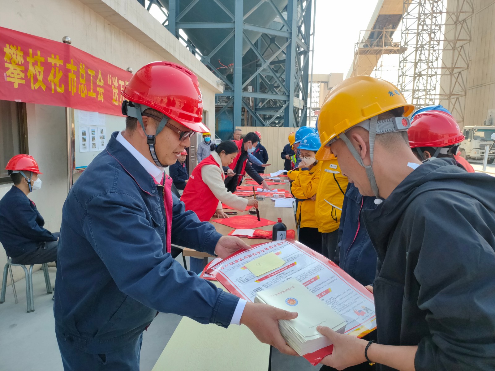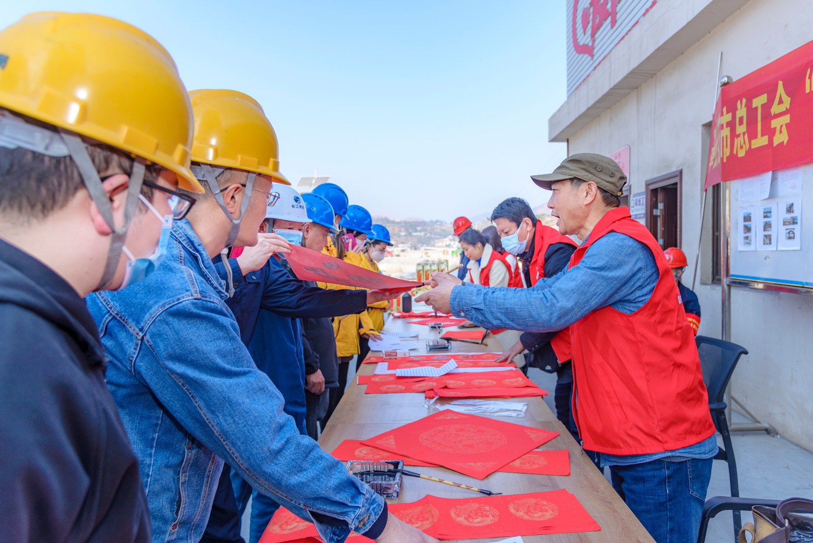 1月17日,公司工會與攀枝花市總工會聯(lián)合組織開展了送萬福、送慰問、宣傳消防安全等活動。邀請書法大師為春節(jié)期間堅守在工程建設一線職工繪“?!弊?、寫春聯(lián)。在“愛心驛站”活動現(xiàn)場,鋪著紅色春聯(lián)紙的桌子呈一字型排開,書法大師們帶著滿滿的誠意與祝福,揮毫潑墨,大家手捧一副副精美的春聯(lián),一個個火紅喜慶的“?!弊忠约靶麓捍蠖Y包,喜悅之情溢于言表。