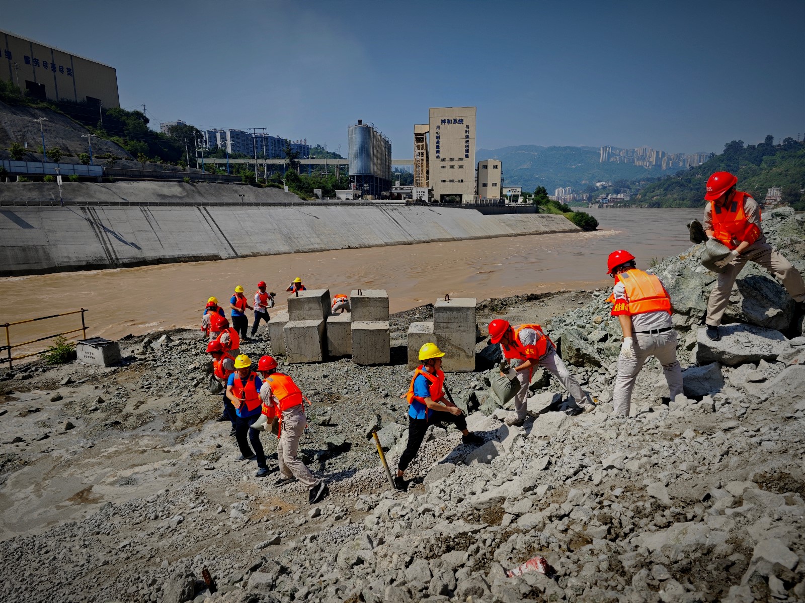 活動中,由公司黨員領(lǐng)導帶頭,分組對導流明渠邊坡、安全體驗館、上下游圍堰及基坑、導流明渠進出口等部位進行了全面詳細的巡視檢查?;顒舆€對防洪度汛應急物資進行了補充,有的拿鐵鍬、有的拿編織袋,通過緊密配合,迅速完成幾百個防汛沙袋的裝袋,并排成長隊接力運送,將沙袋搬運至重點部位整齊堆放。通過半日的緊張勞動,參加人員衣背早已被汗水浸透,但他們沒有絲毫怨言,更是講到這次活動不僅補充了防汛物資,還真正提高了“防大汛、救大災、搶大險”的安全意識和應急搶險能力,將繼續(xù)堅守工作崗位,以汛為令、聞汛而動,在防洪度汛和應急搶險中發(fā)揮先鋒模范作用,保障銀江水電站工程建設(shè)安全順利推進。
