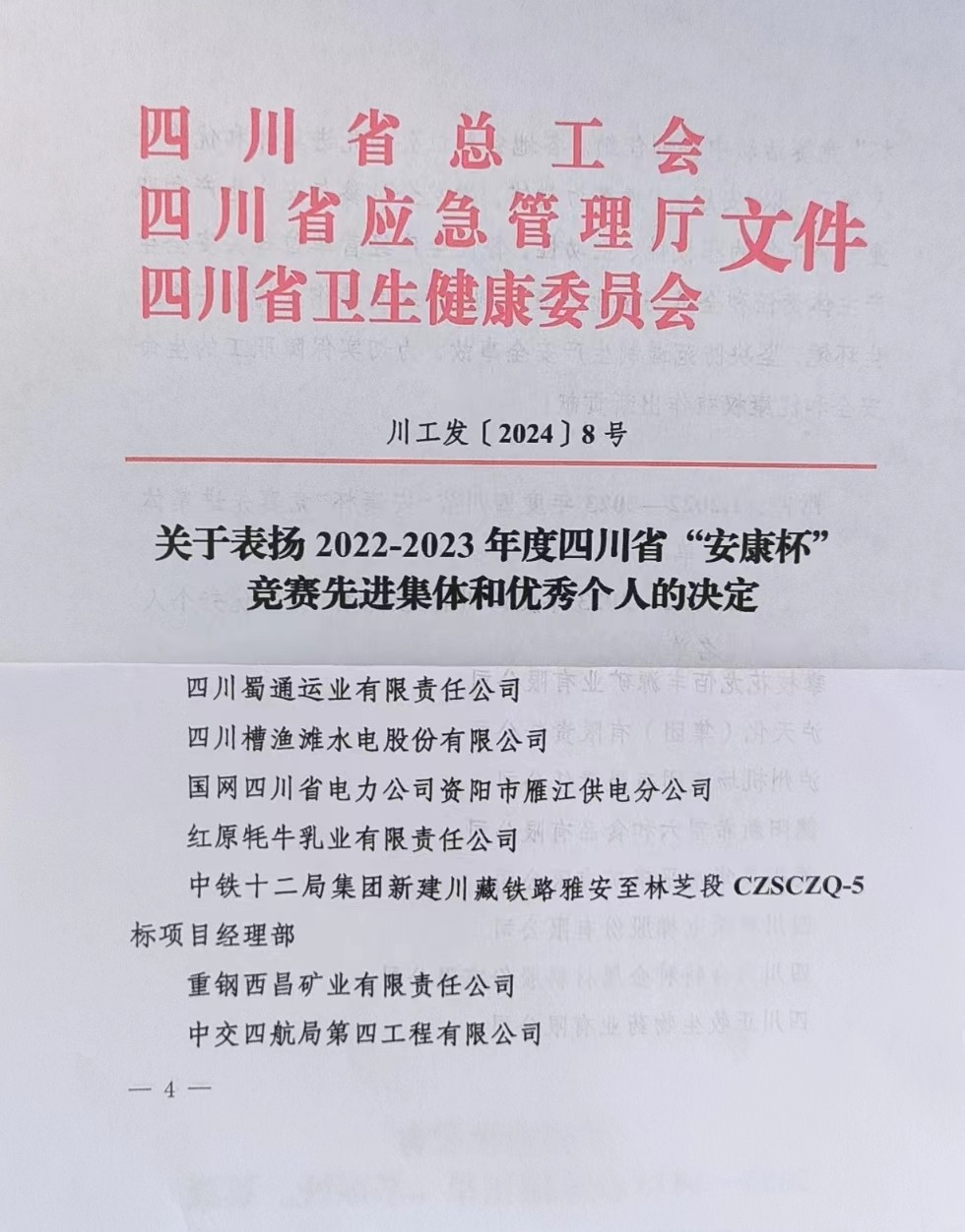 近日,四川省總工會、四川省應(yīng)急管理廳、四川省衛(wèi)生健康委員會聯(lián)合印發(fā)《關(guān)于表彰2022-2023年度四川省“安康杯”競賽先進集體和優(yōu)秀個人的決定》,四川槽漁灘水電股份有限公司(簡稱“槽漁灘公司”)榮獲四川省“安康杯”競賽優(yōu)勝單位榮譽稱號。