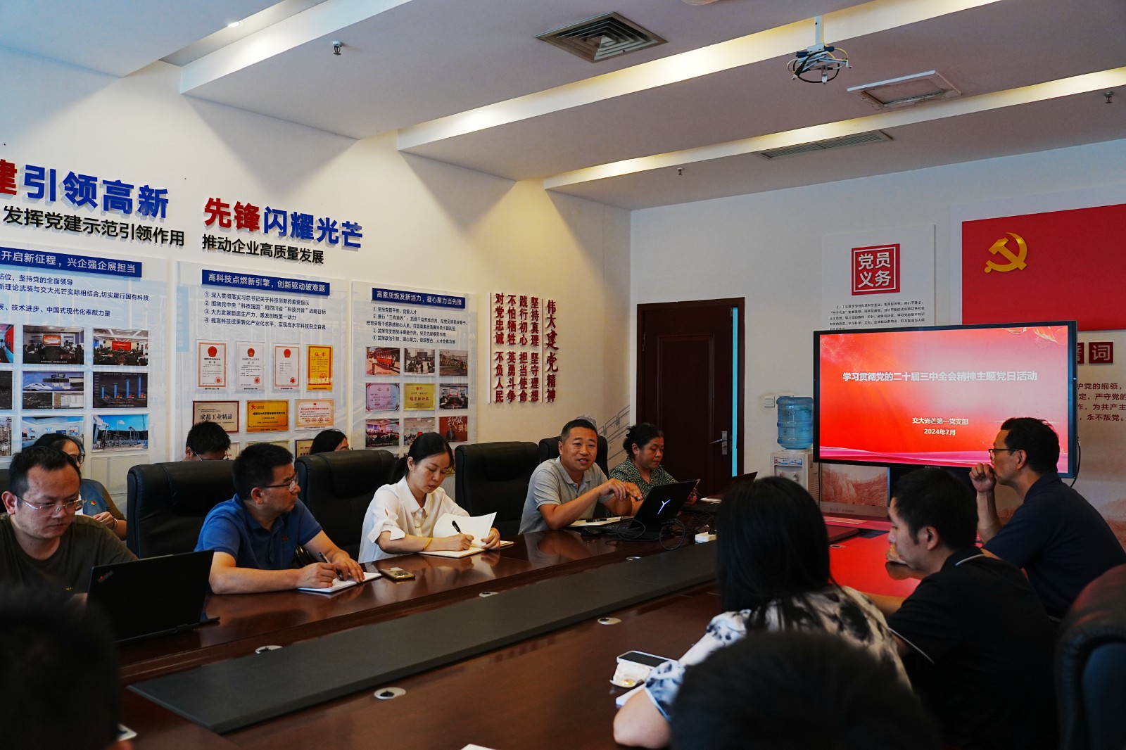 7月29日,交大光芒第一黨支部開展學(xué)習(xí)貫徹黨的二十屆三中全會(huì)及省委十二屆五中全會(huì)精神主題黨日活動(dòng)。活動(dòng)由支部書記王輝主持,支部全體黨員、入黨積極分子參加。黨總支書記、常務(wù)副總經(jīng)理王濤以及黨總支副書記、總經(jīng)理助理汪志橋以普通黨員身份參加。