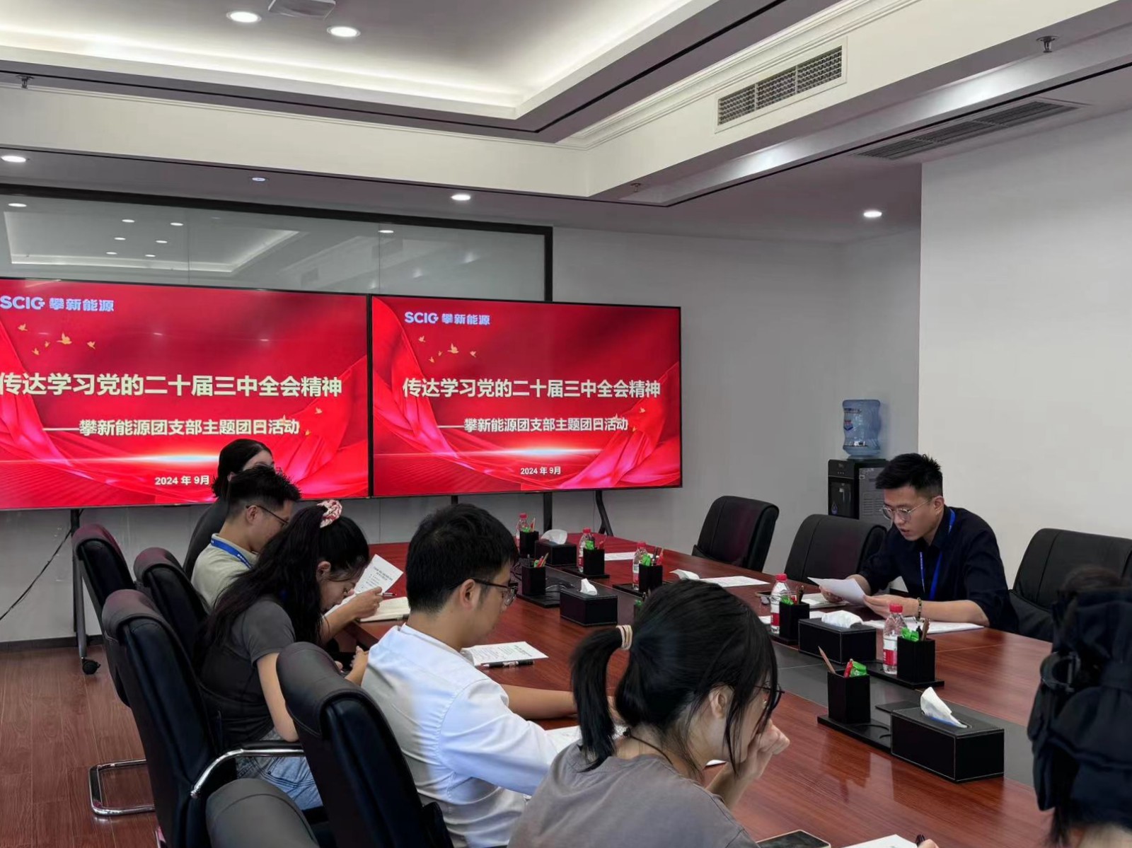 近日,攀新能源公司團支部在川投大廈707會議室舉行2024年9月主題團日活動,專題傳達學(xué)習(xí)《中國共產(chǎn)黨第二十屆中央委員會第三次全體會議公報》,學(xué)習(xí)貫徹黨的二十屆三中全會精神。攀新能源團支部書記、經(jīng)營管理部經(jīng)理潘鑫主持并領(lǐng)學(xué),公司全體團員及屏山抽蓄公司全體團員參會。