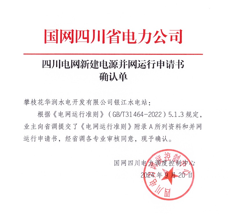 9月20日,在國網(wǎng)四川省電力公司和川投能源的指導幫助下,經過積極對接、多方協(xié)調,攀水電公司成功取得銀江水電站新建電源并網(wǎng)運行申請書確認單,標志著銀江水電站具備并網(wǎng)手續(xù)辦理的資格條件。
