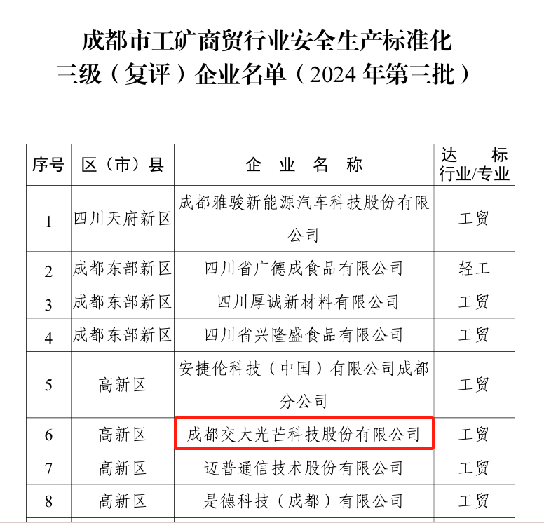 2024年9月,成都市應(yīng)急局發(fā)布《關(guān)于公布成都市工礦商貿(mào)行業(yè)安全生產(chǎn)標(biāo)準(zhǔn)化三級(jí)(復(fù)評(píng))企業(yè)名單(2024年第三批)的通知》,交大光芒通過(guò)安全生產(chǎn)標(biāo)準(zhǔn)化三級(jí)達(dá)標(biāo)復(fù)評(píng)。
