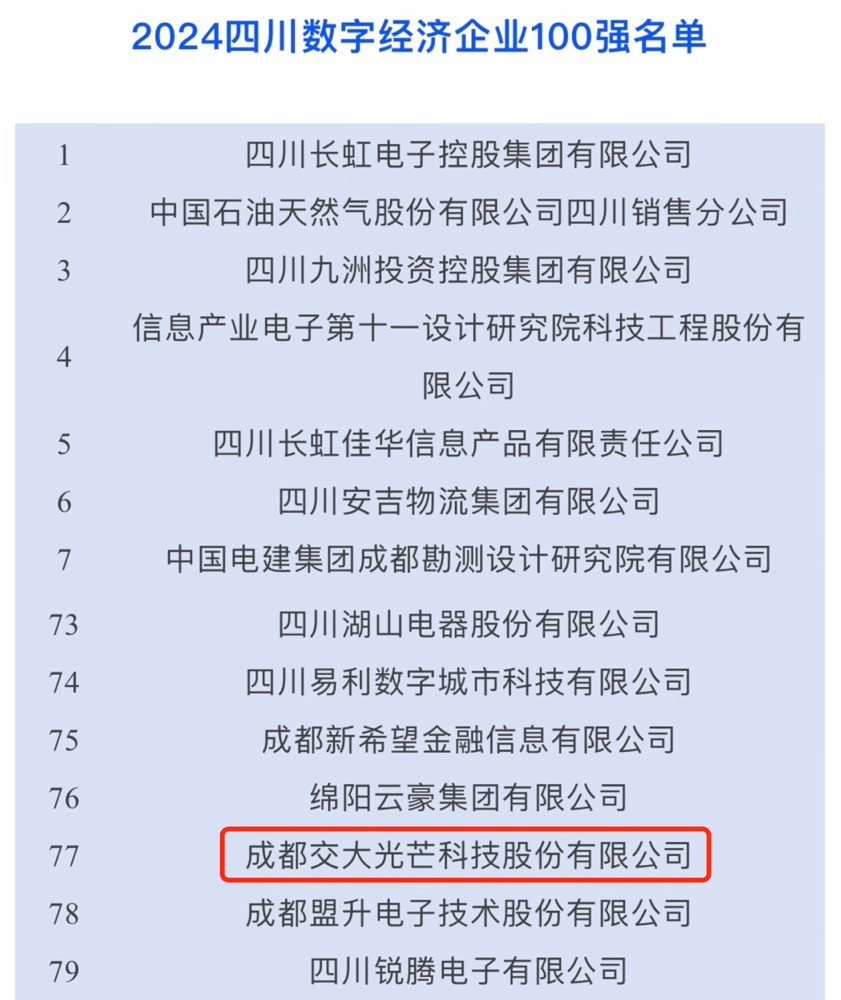 9月26日,四川大企業(yè)大集團發(fā)展大會在成都召開,會上,四川省企業(yè)聯(lián)合會發(fā)布了2024年四川企業(yè)100強、制造業(yè)100強、服務業(yè)100強和數(shù)字經(jīng)濟100強榜單,交大光芒榮登四川數(shù)字經(jīng)濟企業(yè)100強榜單,位列第77位。