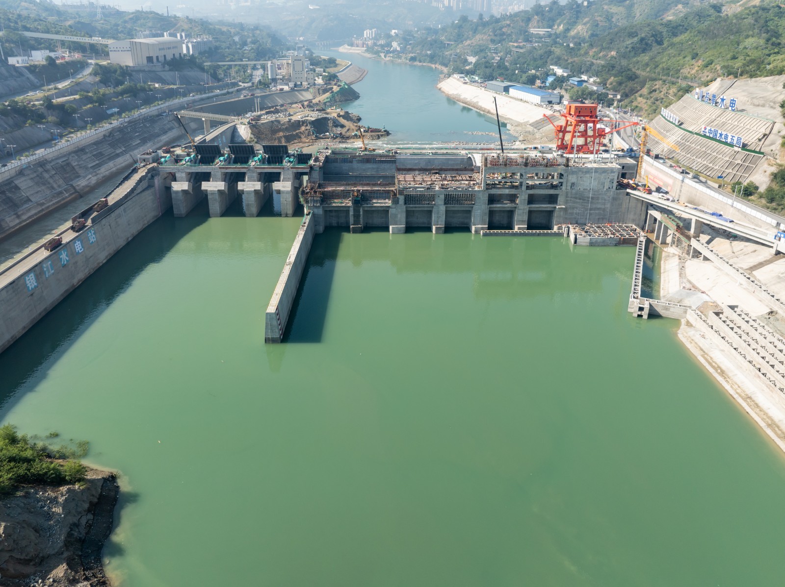 18日中午起,銀江水電站導(dǎo)流明渠開始全面截流進(jìn)占,百余輛自卸車將石料拋投進(jìn)戧堤龍口,導(dǎo)流明渠過(guò)流通道緩緩關(guān)閉,金沙江水全部從溢流壩段流向下游,成功實(shí)現(xiàn)了導(dǎo)流明渠截流合龍,打贏了銀江水電站蓄水發(fā)電階段“五大戰(zhàn)役”中具有里程碑意義的第二戰(zhàn),向著首臺(tái)機(jī)組發(fā)電目標(biāo)又邁進(jìn)了重要一步。