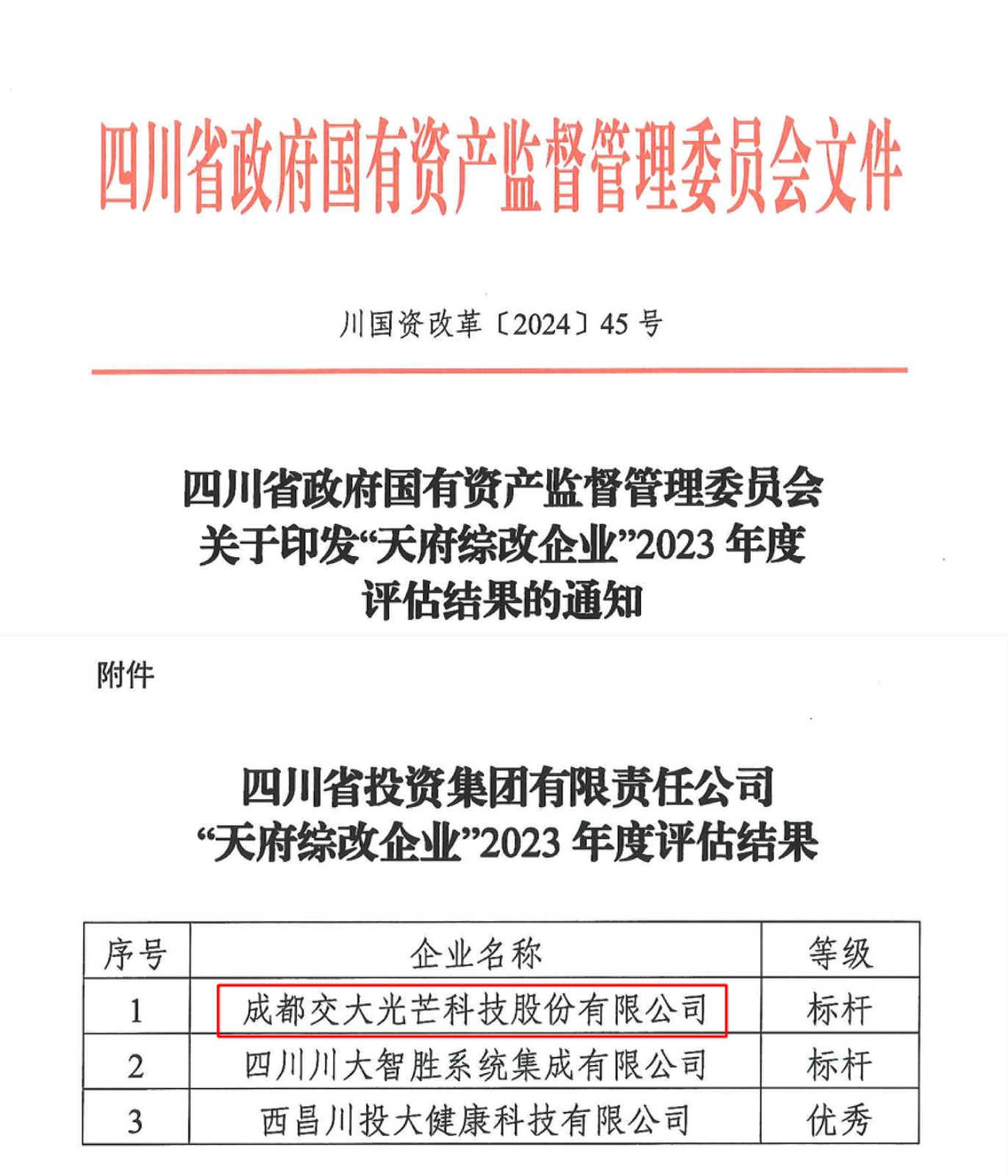 近日,四川省國資委印發(fā)“天府綜改企業(yè)”2023年度評估結(jié)果,交大光芒被評為A級(標桿)。此次評估由省國資委聘請獨立第三方機構(gòu)進行,97戶“天府綜改企業(yè)”中被評為A級(標桿)的共22戶。