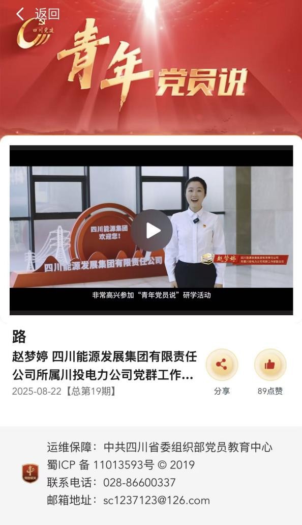 近期,四川省委組織部舉辦的“青年黨員說”研學(xué)活動正在四川黨建官網(wǎng)等平臺集中展播。省國資委黨委共推薦10名青年黨員代表圍繞“學(xué)習(xí)新思想,爭當改革先鋒”為主題,談體會、談感悟。其中,由四川能源發(fā)展集團上報、川投能源推薦的作品《路》,通過講述“兩路”精神的歷史內(nèi)涵,結(jié)合川投電力腳基坪電廠震后緊急搶險、天彭電力鳳鳴湖水庫飲水廊道清淤、玉田電廠為涼山州彝族村民送水送電等鮮活事例,展現(xiàn)能源人在逆行搶險、為民服務(wù)和民族團結(jié)中的責(zé)任擔(dān)當,號召新時代國企人賡續(xù)“兩路”精神,汲取奮進力量,展現(xiàn)了能源國企的使命擔(dān)當。