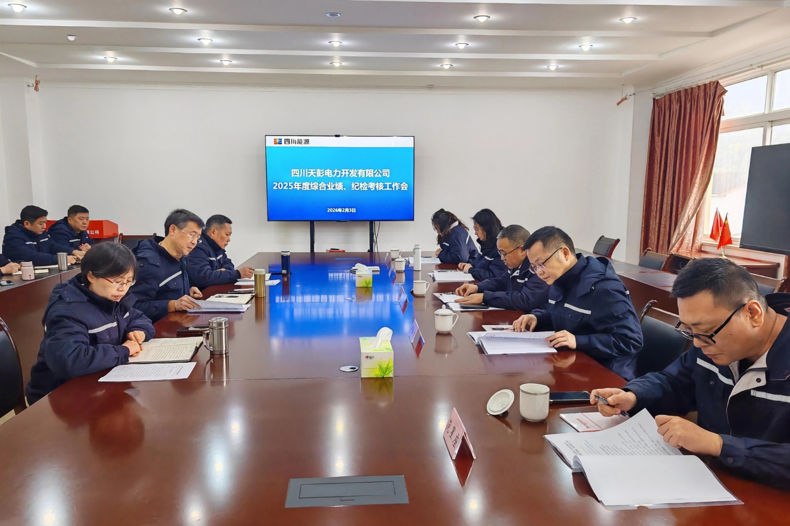 為切實發(fā)揮考核“指揮棒”作用,壓實工作責任、推動企業(yè)高質(zhì)量發(fā)展,根據(jù)川投電力統(tǒng)一工作安排,近日,川投電力副總經(jīng)理、天彭電力考核組組長陳云明率考核組一行,赴天彭電力開展2025年度綜合業(yè)績及紀檢工作專項考核??己私M成員、天彭電力領導班子全體成員、全體中層干部及員工代表參加考核會議,會議由川投電力計劃合同部副經(jīng)理劉應心主持。