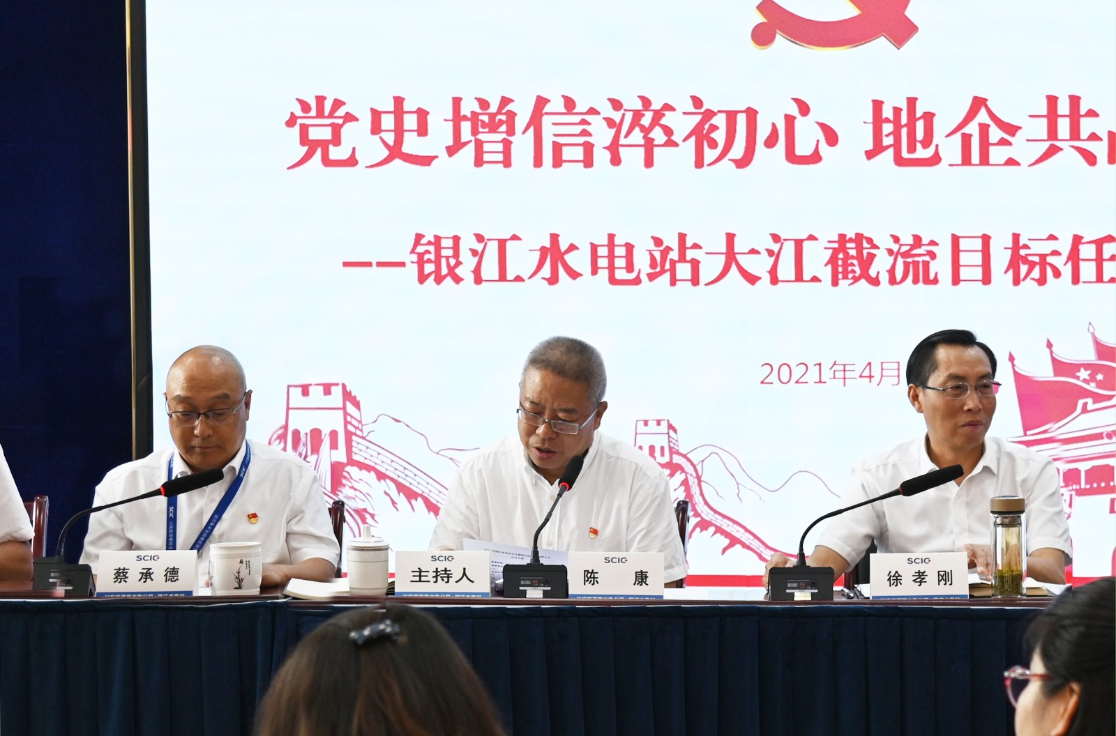 會議由東區(qū)區(qū)委常委、政法委書記、銀江水電站項目推進領導小組常務副組長陳康主持,川投能源副總經(jīng)理、攀水電公司黨總支書記、董事長徐孝剛,黨總支副書記、總經(jīng)理蔡承德,副總經(jīng)理周軍及公司黨員代表和東區(qū)政府相關部門等共計40 余人參會。