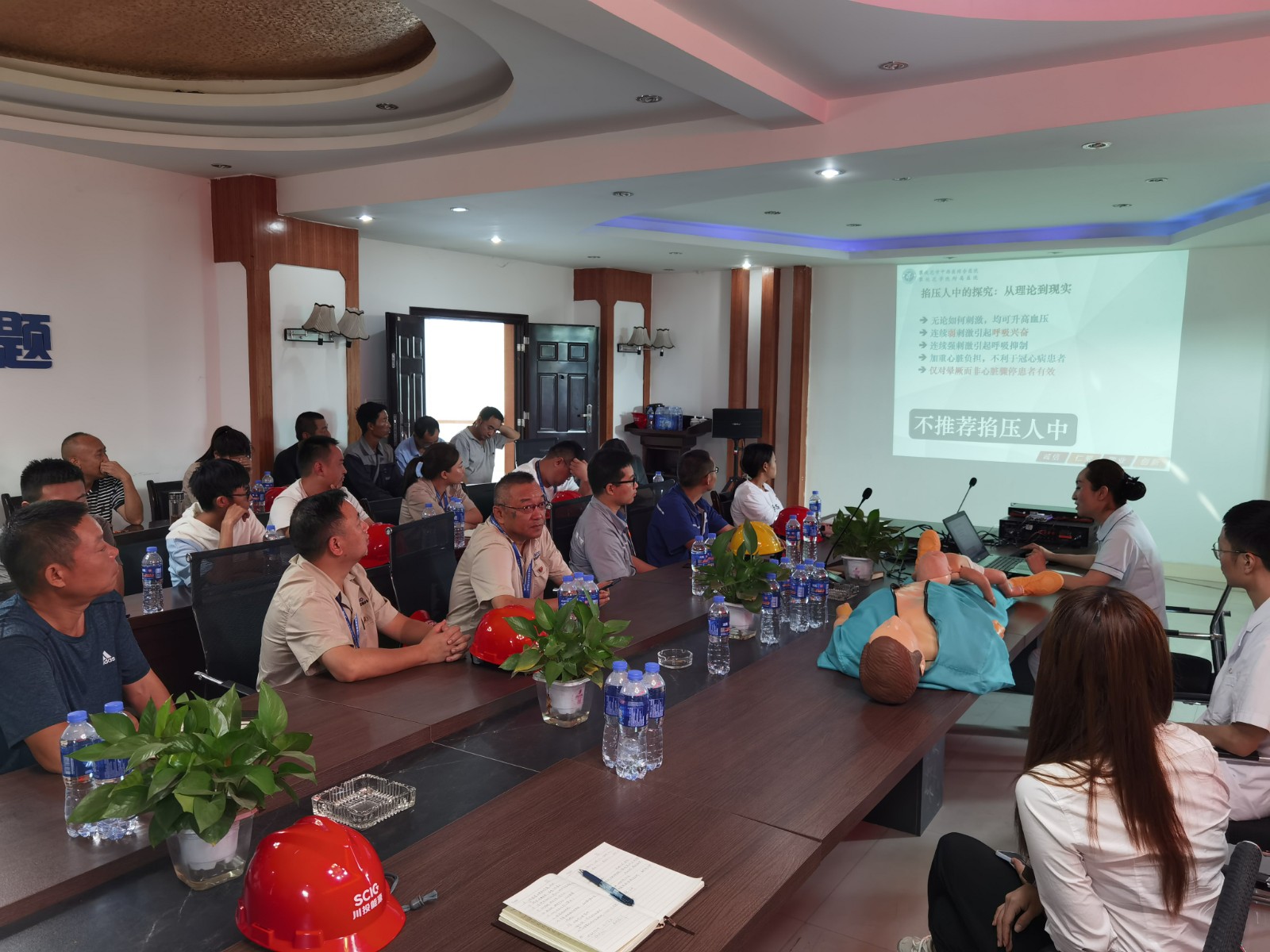 本次培訓(xùn)內(nèi)容包括心肺復(fù)蘇搶救、現(xiàn)場(chǎng)處置急救兩部分。培訓(xùn)老師首先對(duì)心肺復(fù)蘇被搶救人員的表現(xiàn)癥狀、搶救過(guò)程、注意事項(xiàng)等理論知識(shí)進(jìn)行了詳細(xì)的講解;其次結(jié)合日常生活和工程建設(shè)過(guò)程中可能發(fā)生的呼吸道異物堵塞、外傷現(xiàn)場(chǎng)止血和包扎、燙傷、犬傷(狂犬?。┑痊F(xiàn)場(chǎng)搶救理論知識(shí)進(jìn)行了詳細(xì)講解。理論知識(shí)講解結(jié)束后,培訓(xùn)老師以學(xué)員為模特進(jìn)行了外傷包扎操作演示;由學(xué)員利用教學(xué)模型逐一進(jìn)行了心肺復(fù)蘇實(shí)際操作練習(xí),培訓(xùn)老師全程進(jìn)行耐心的糾正和指導(dǎo),直至學(xué)員操作合格。