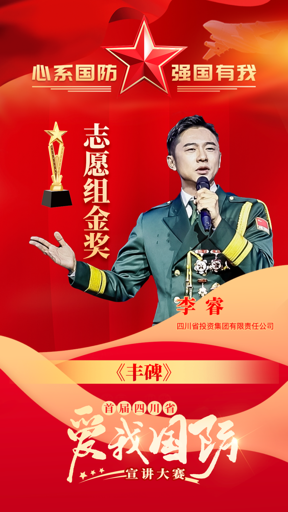 講好新時代國防故事、傳播新時代國防聲音。7月8日,首屆四川省“愛我國防”宣講大賽成果展演在四川廣播電視臺精彩上演,來自全省21個市州和省直有關(guān)部門的170名選手代表參與展演,展示大賽成果?,F(xiàn)場揭曉了本屆大賽的金獎和銀獎獲得者,其中,川投能源選手李睿榮獲金獎!